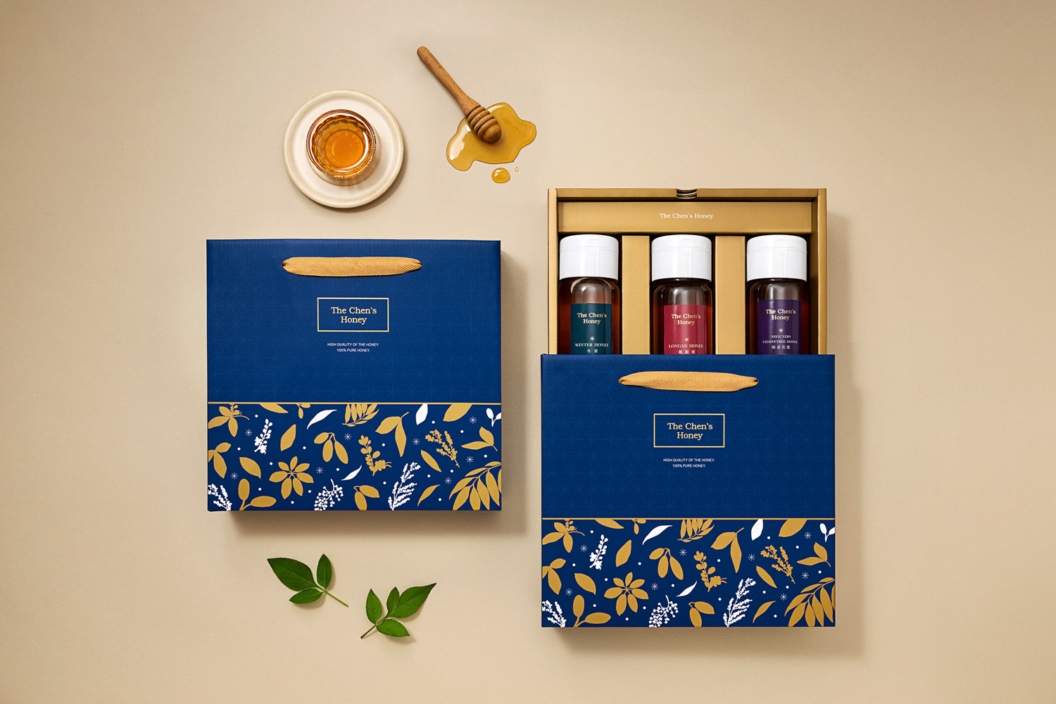 敦阜形象策略以沉穩典雅的配色與設計,為陳家蜂蜜的「經典蜂味」翻新視覺形象,注入更多質感與品味。。